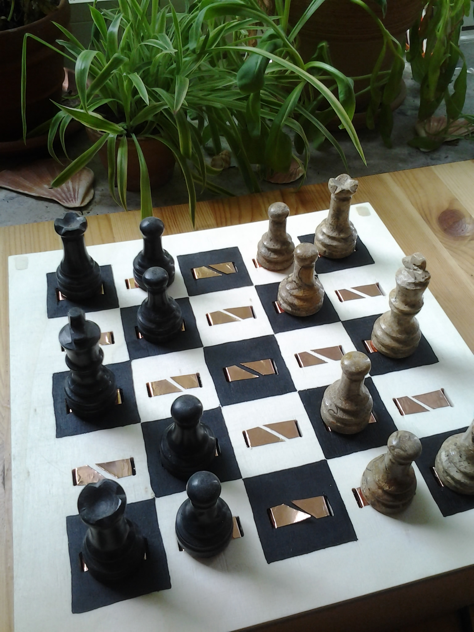 Auf dem Holzschachbrett gibt es pro Feld zwei Einschnitte, durch die Kupferfoliestreifen unter das Brett führen. Diese haben auf der Oberseite einen kleinen Abstand. Jede Figur hat auf ihrer Unterseite ebenfalls Kupferfolie. Wird nun eine Figurauf ein Feld gestellt, verbindet die Figuren-Kupferfolie die beiden Streifen auf dem Feld und schließt damit den Stromkreis. Diese Information wird über die Multiplexer und den Arduino an den Computer übermittelt. Das heißt: Strom fließt → auf diesem Feld steht eine Figur, Strom fließt nicht → das Feld ist frei.